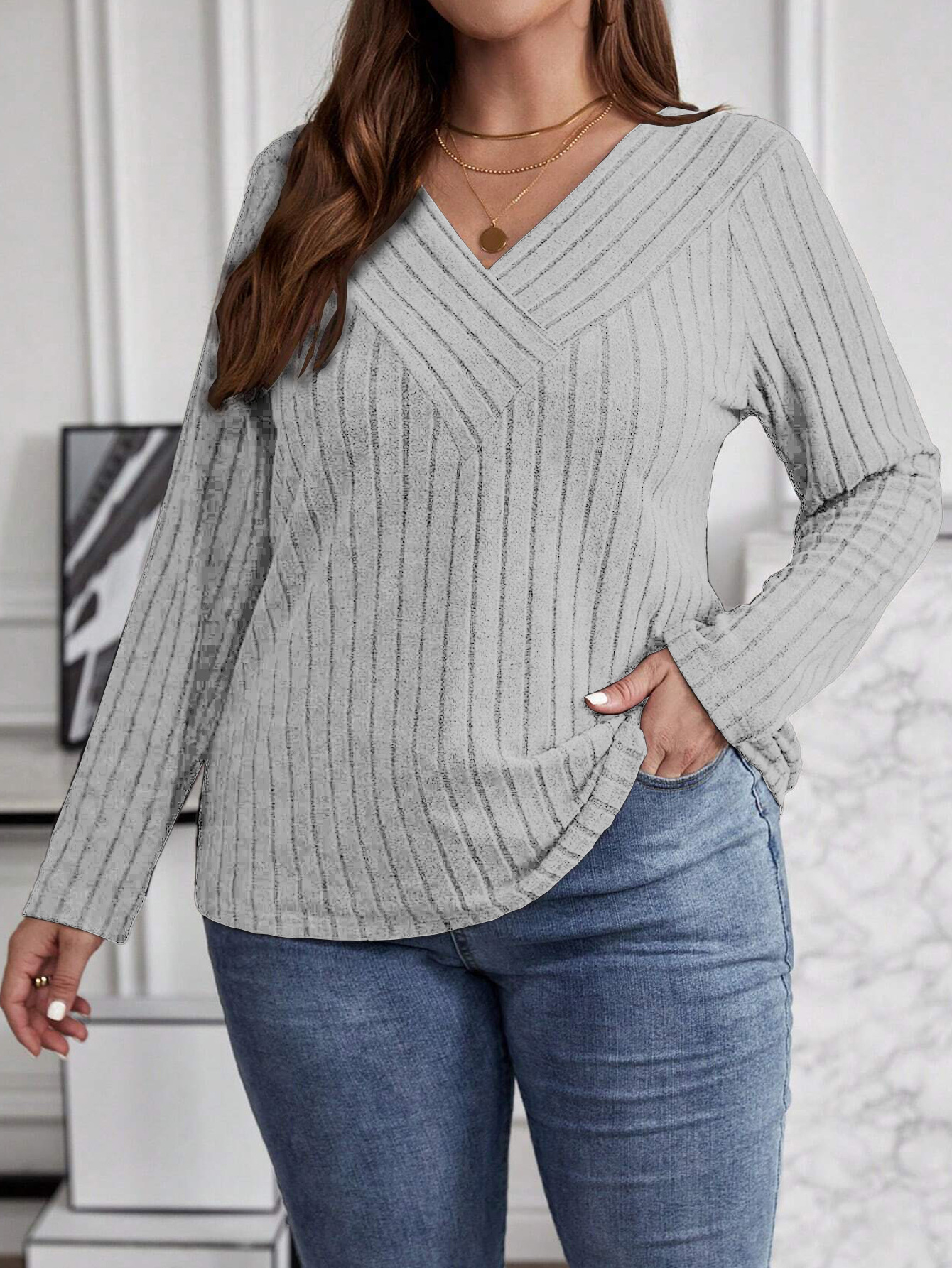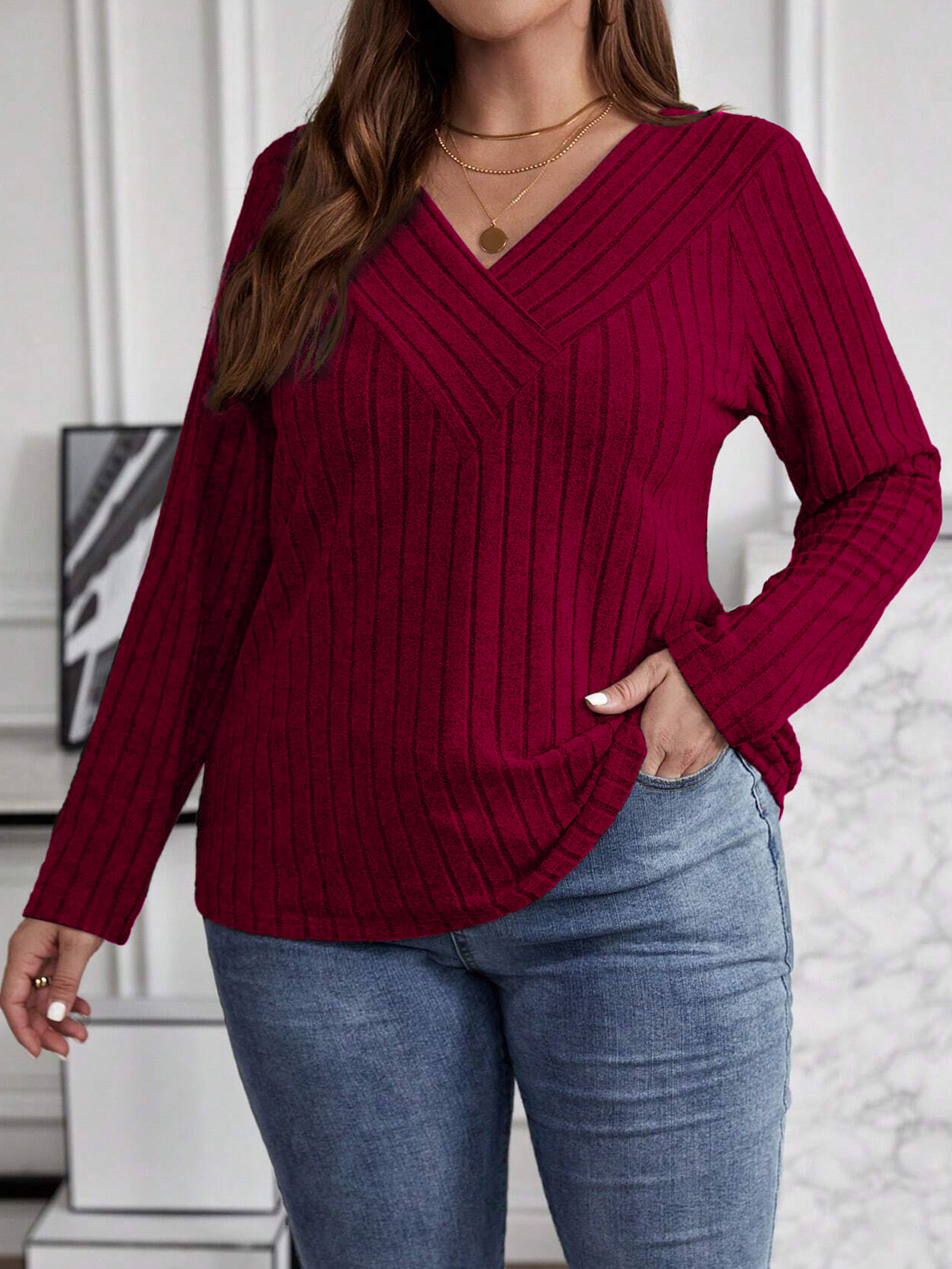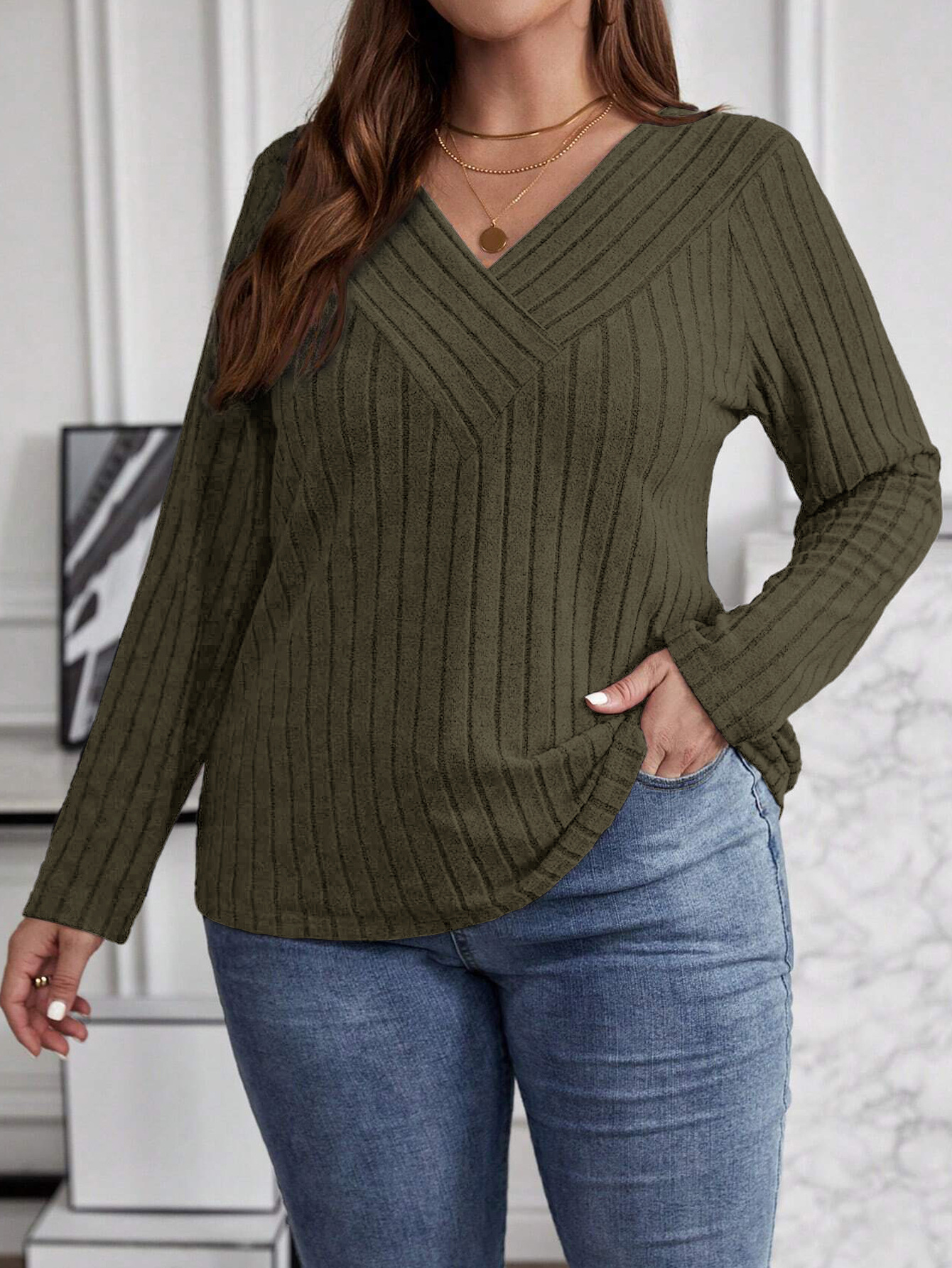 Autumn And Winter Solid Color Plus-size Cross V-neck Long-sleeve Ribbed Brushed Pullover T-shirt Top
