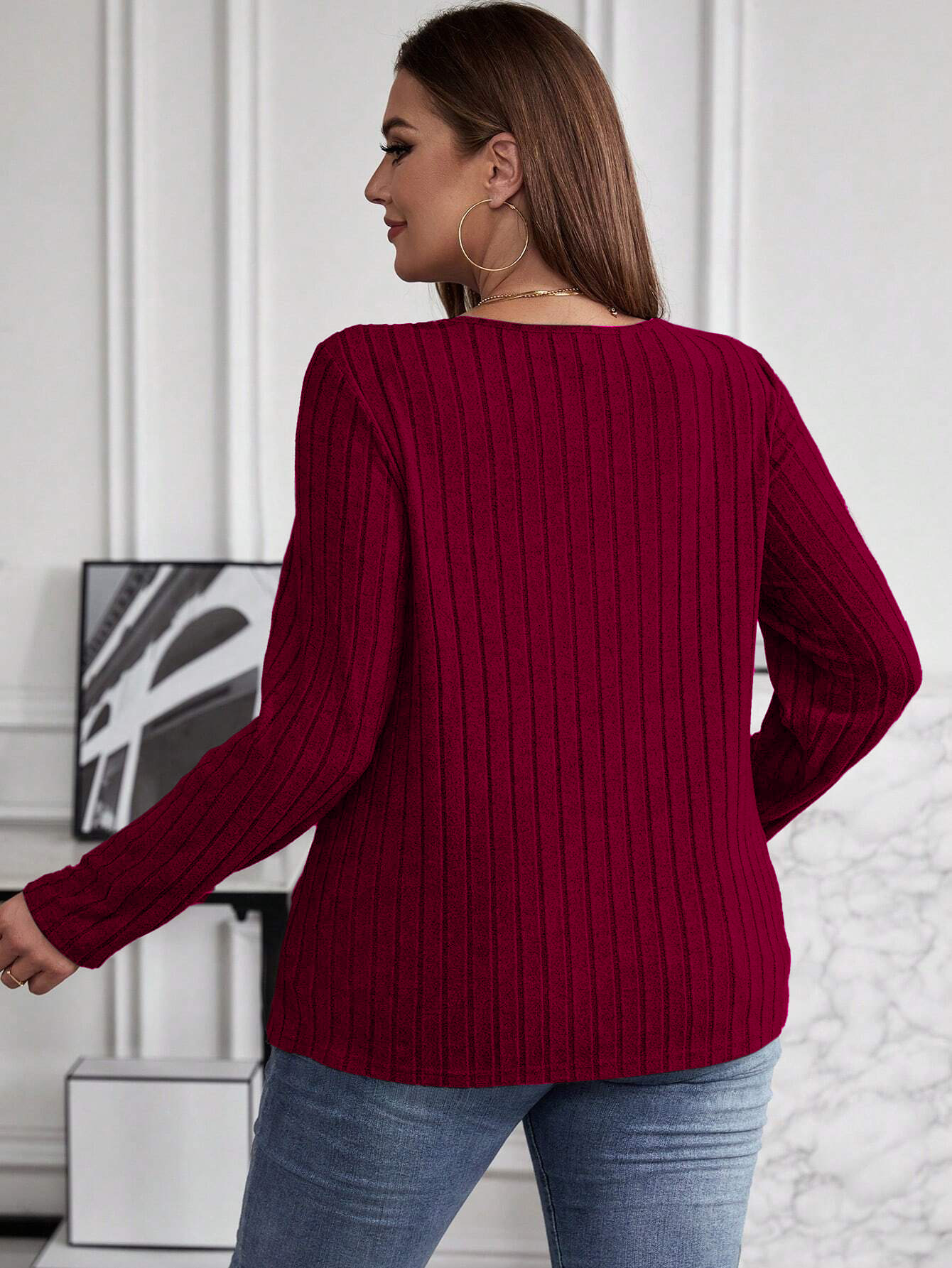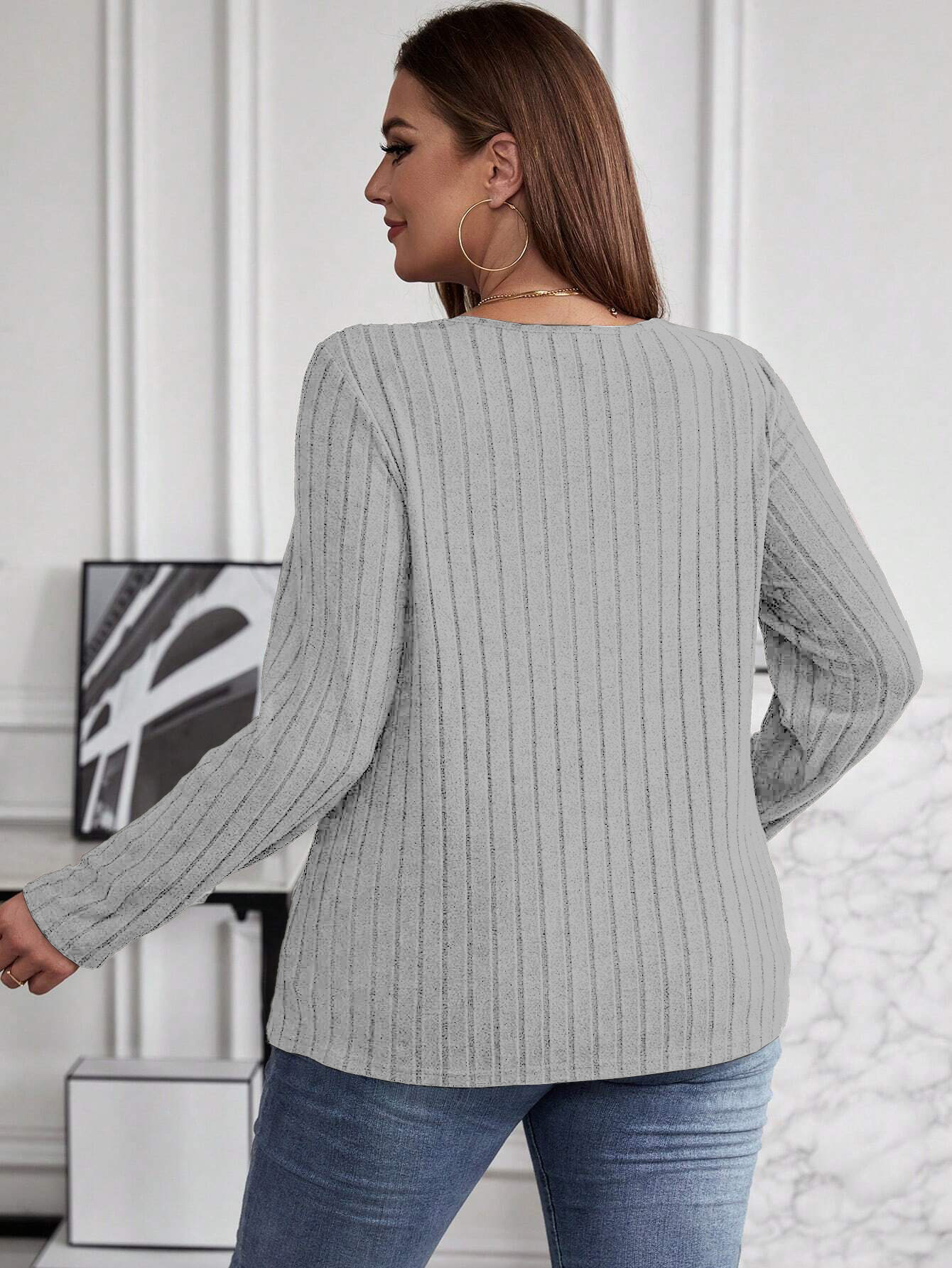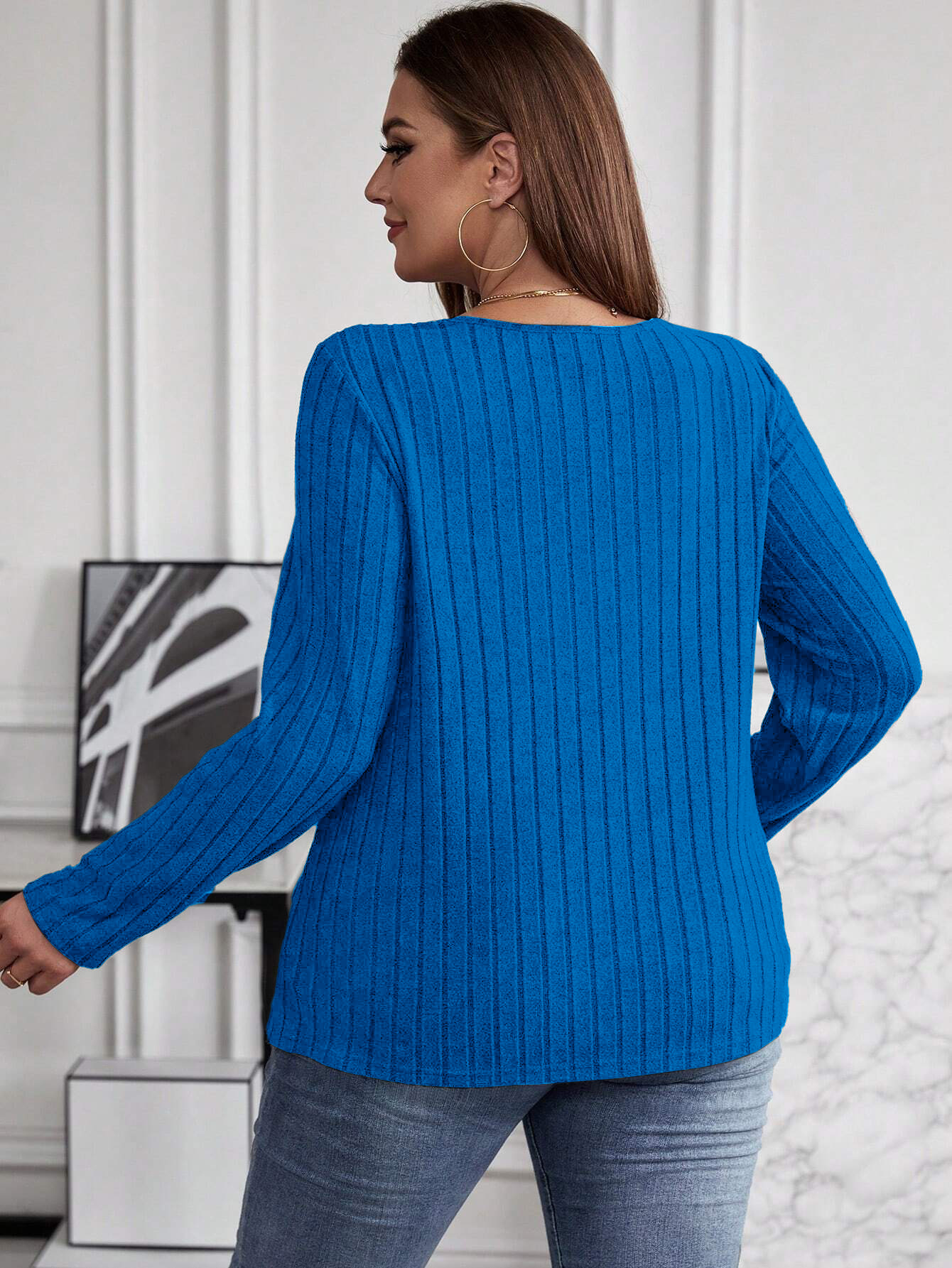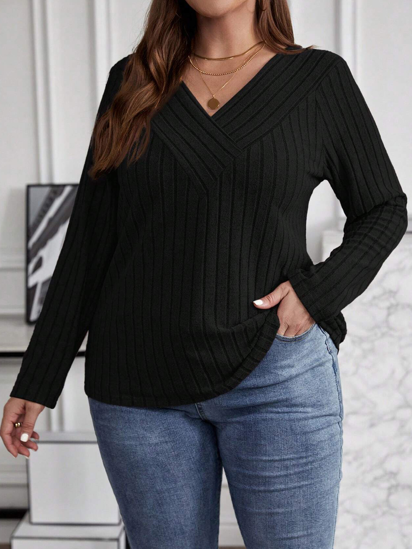 Autumn And Winter Solid Color Plus-size Cross V-neck Long-sleeve Ribbed Brushed Pullover T-shirt Top