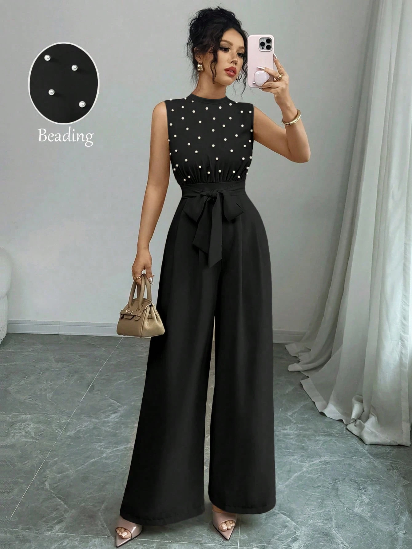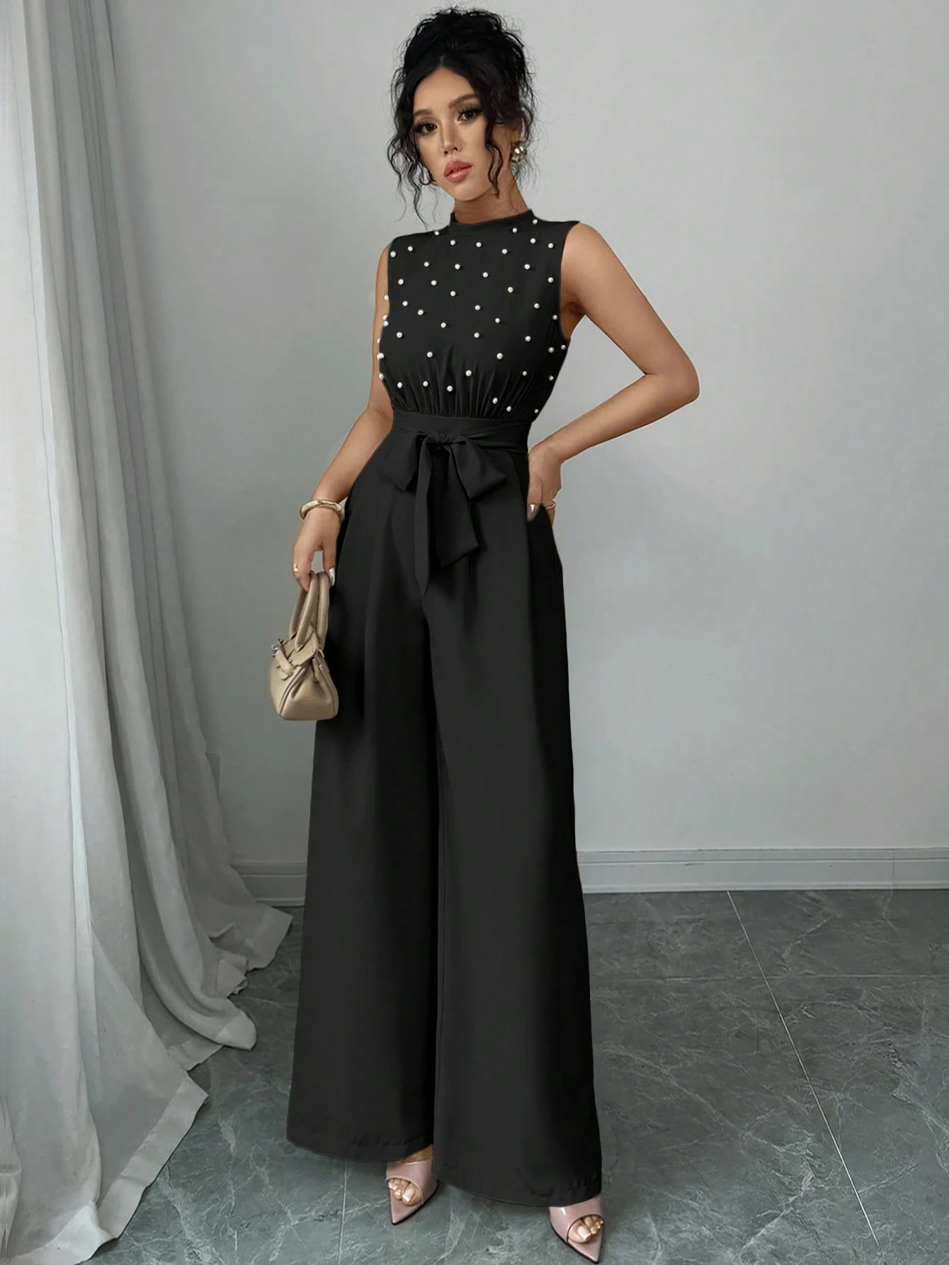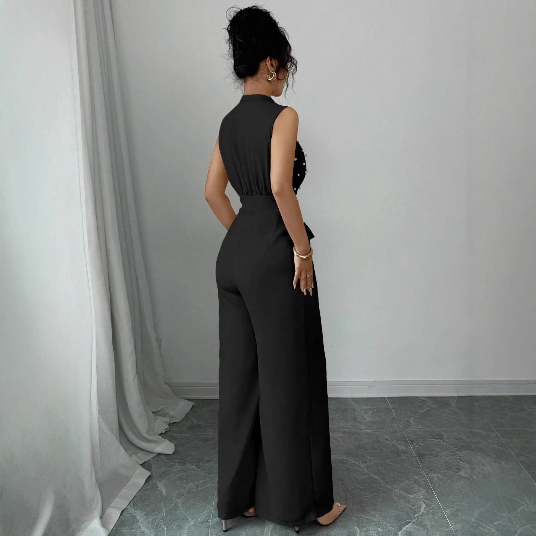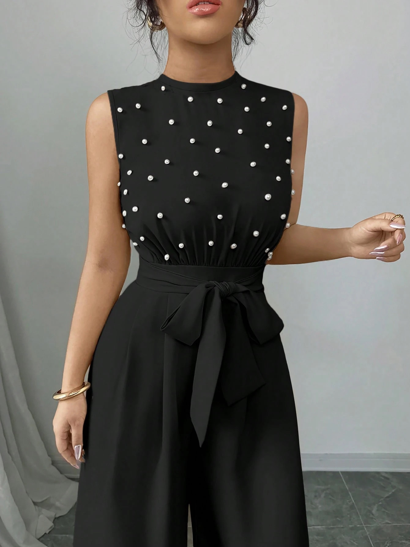 Black Polka Dot Sleeveless Wide-leg Jumpsuit With Round Neck