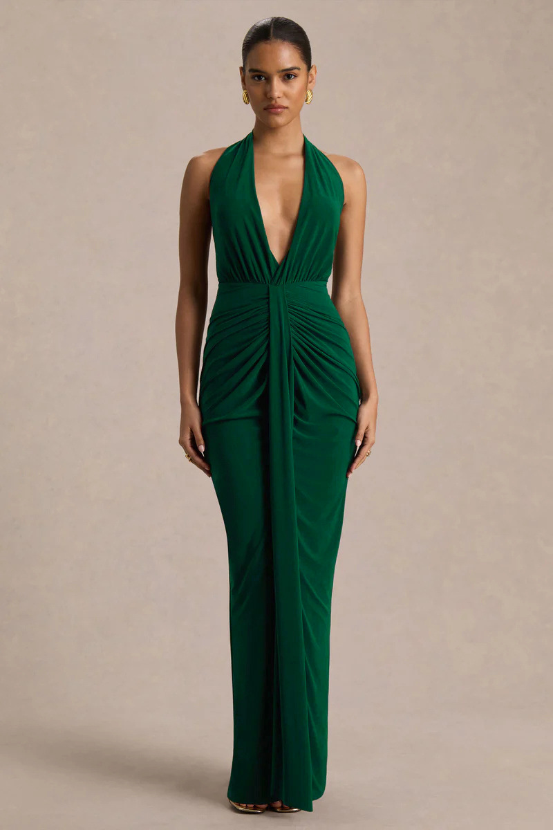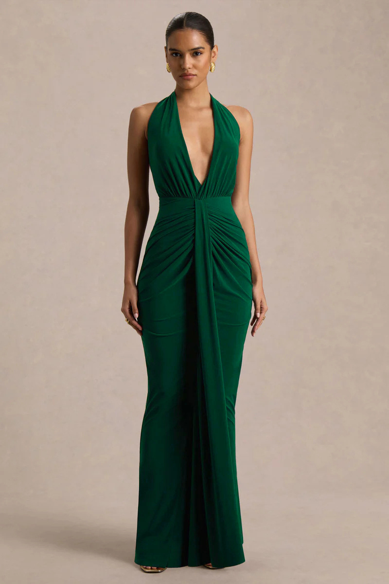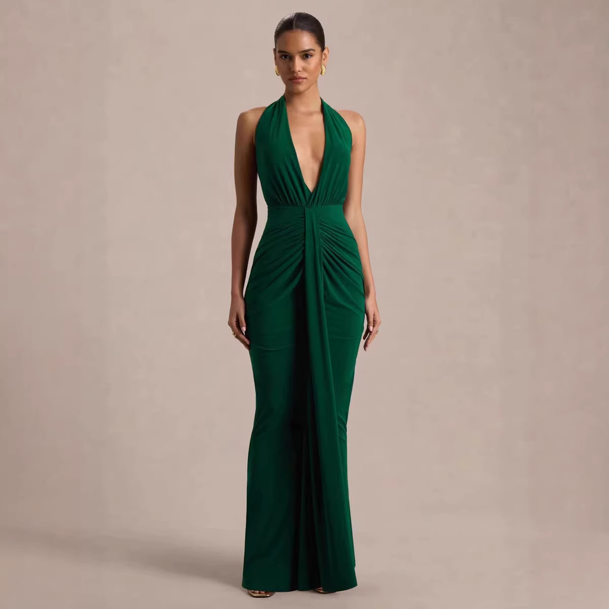 Chic V Neck Halter Dress With A Tie Figure Flattering Design And Stylish Pleats