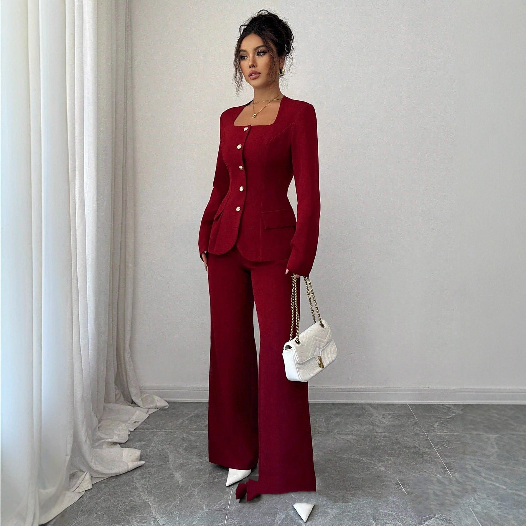 Defined-Waistline Long-Sleeve Top And Wide-Leg Pants Two-Piece Pants Set