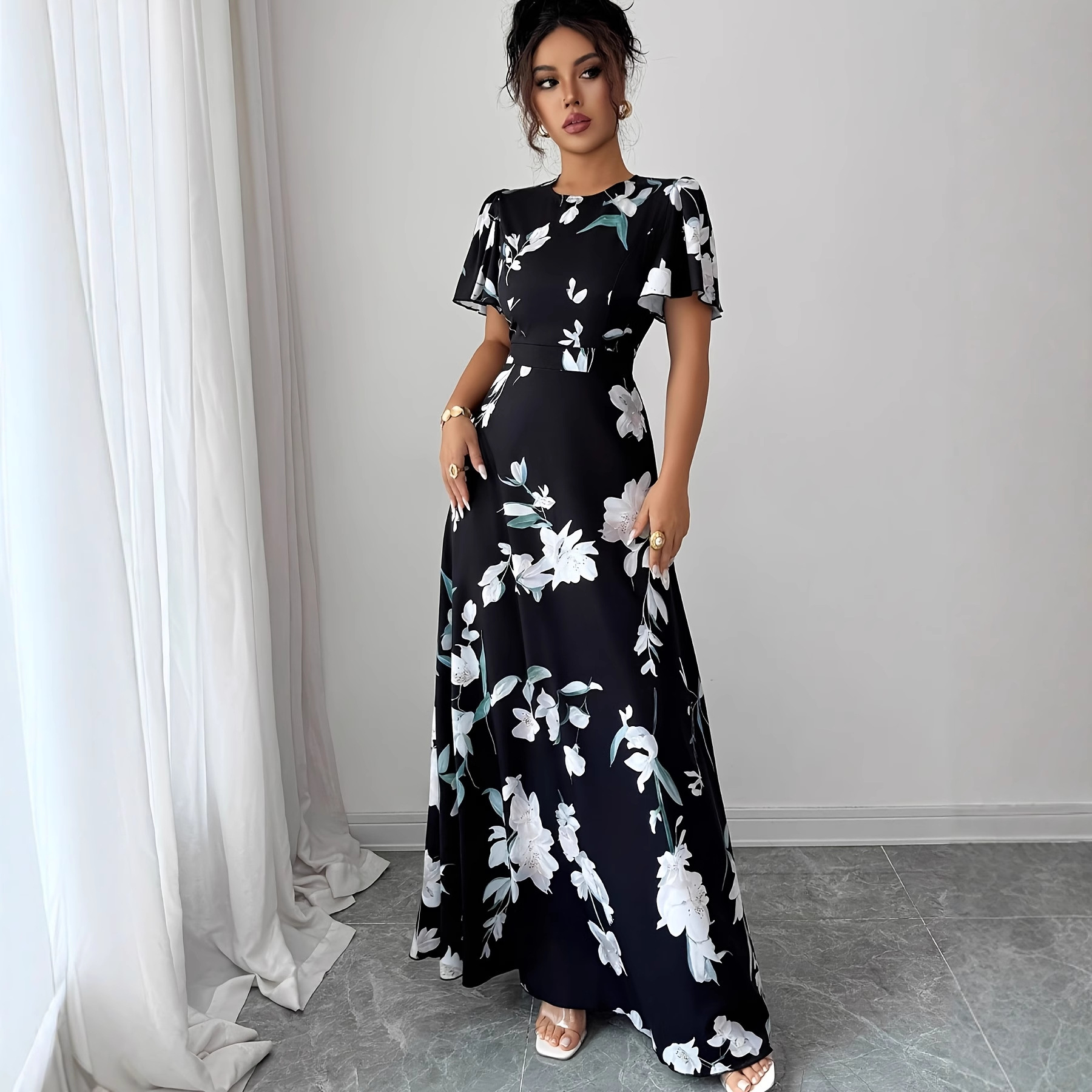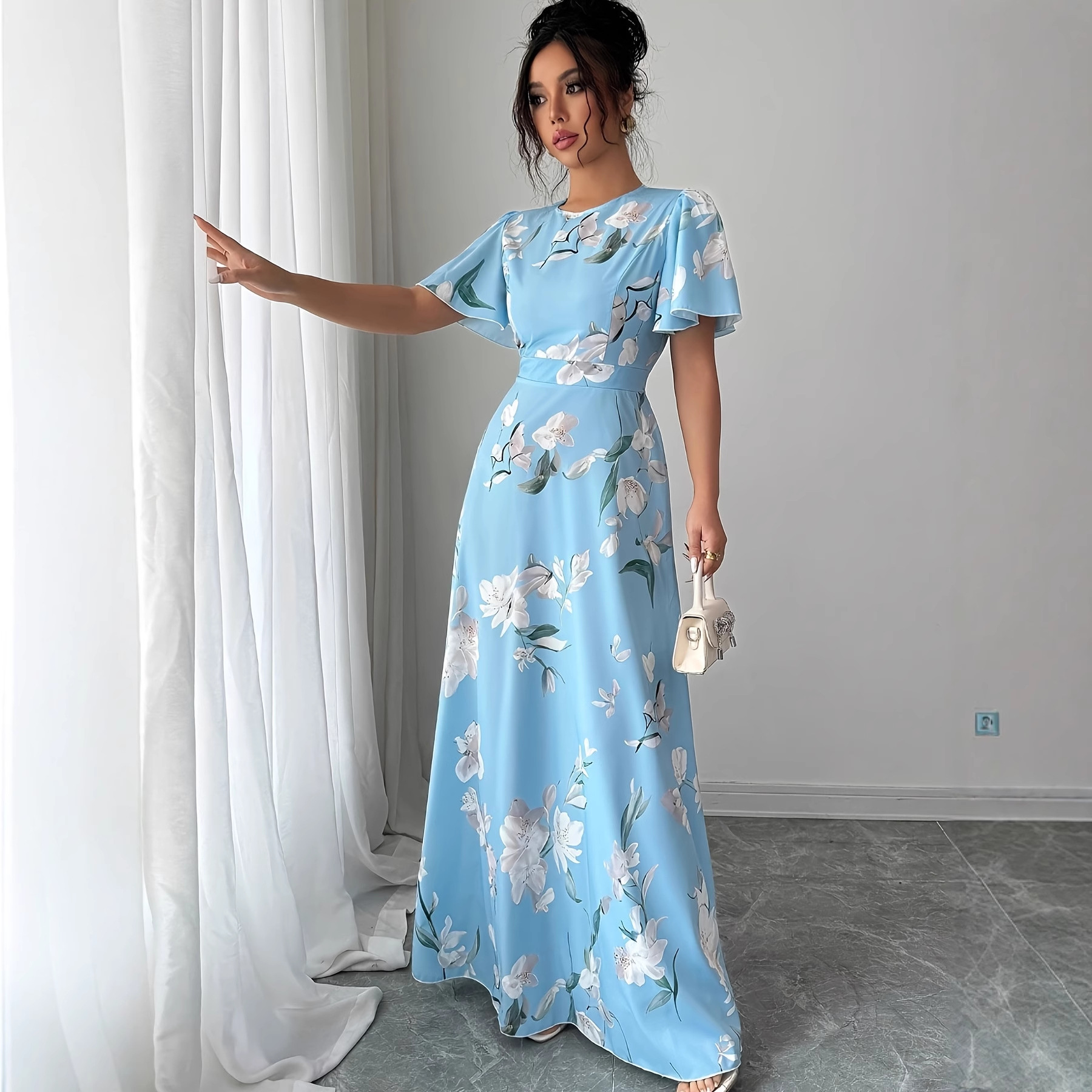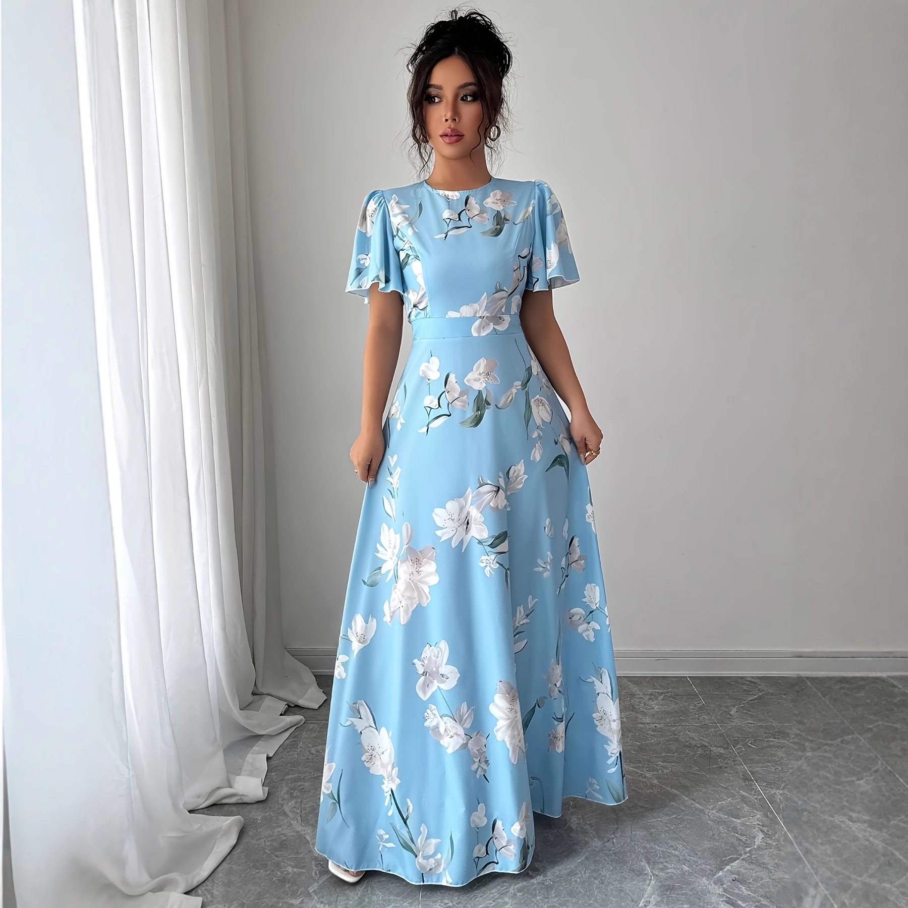 Floral Crew-neck Short-sleeve Waist-cinching Dress