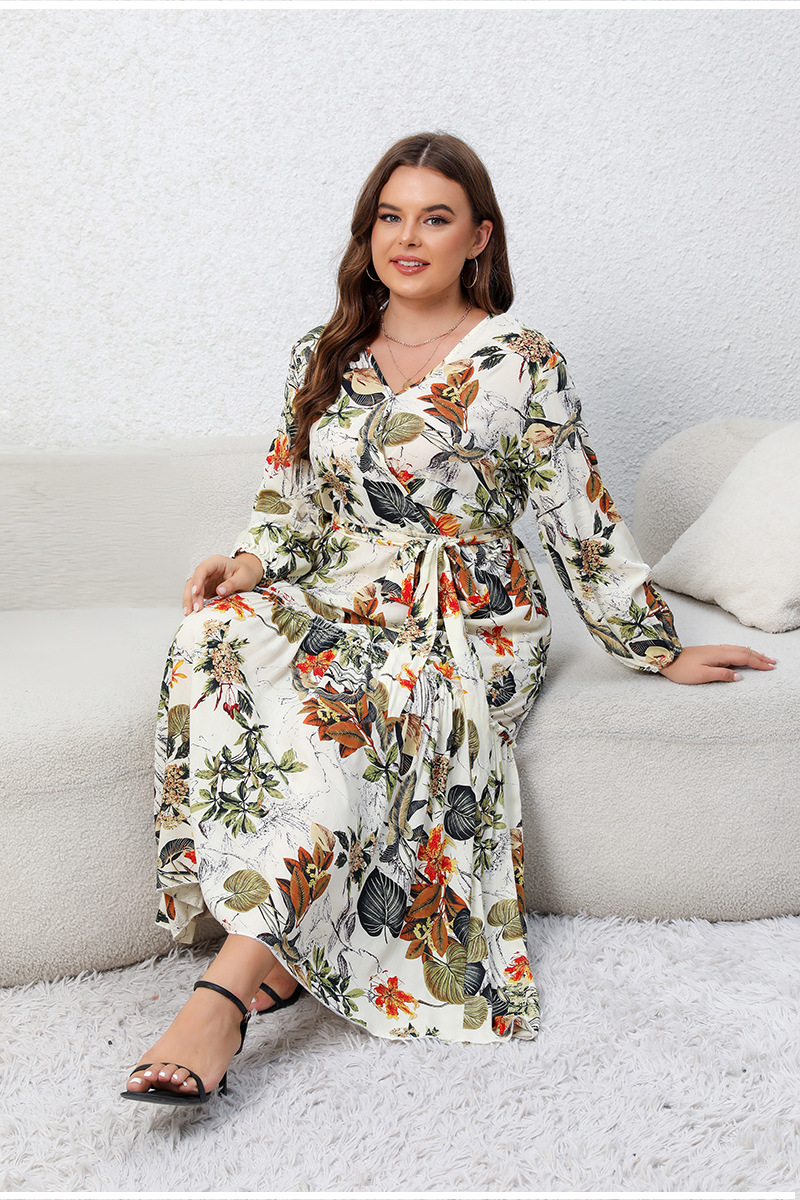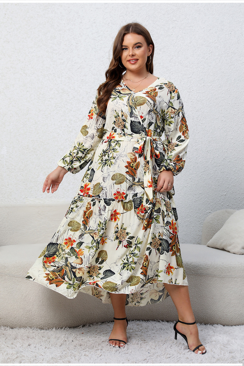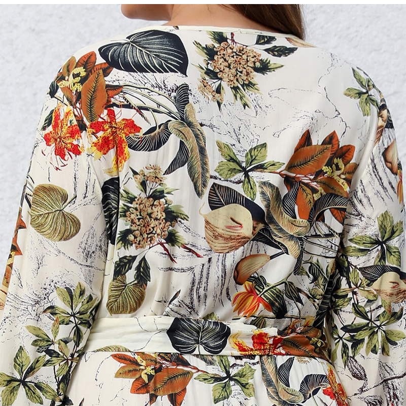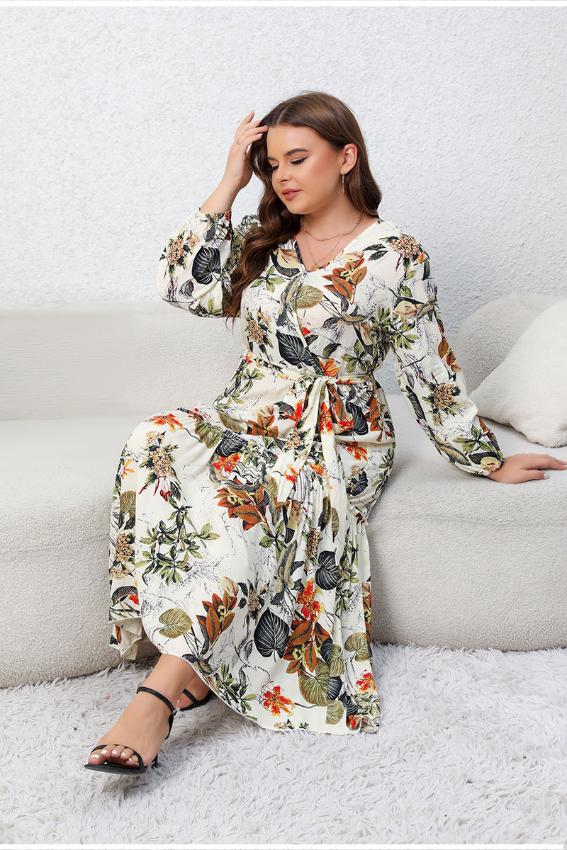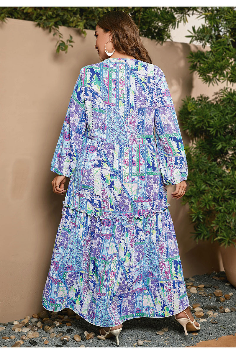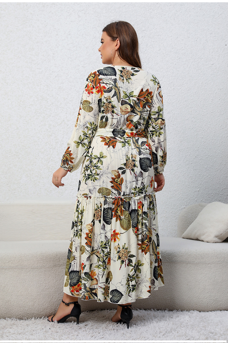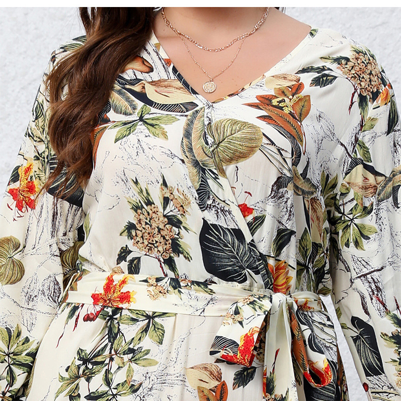 Printed V-neck Long Sleeve Floral Loose Big Hem Dress