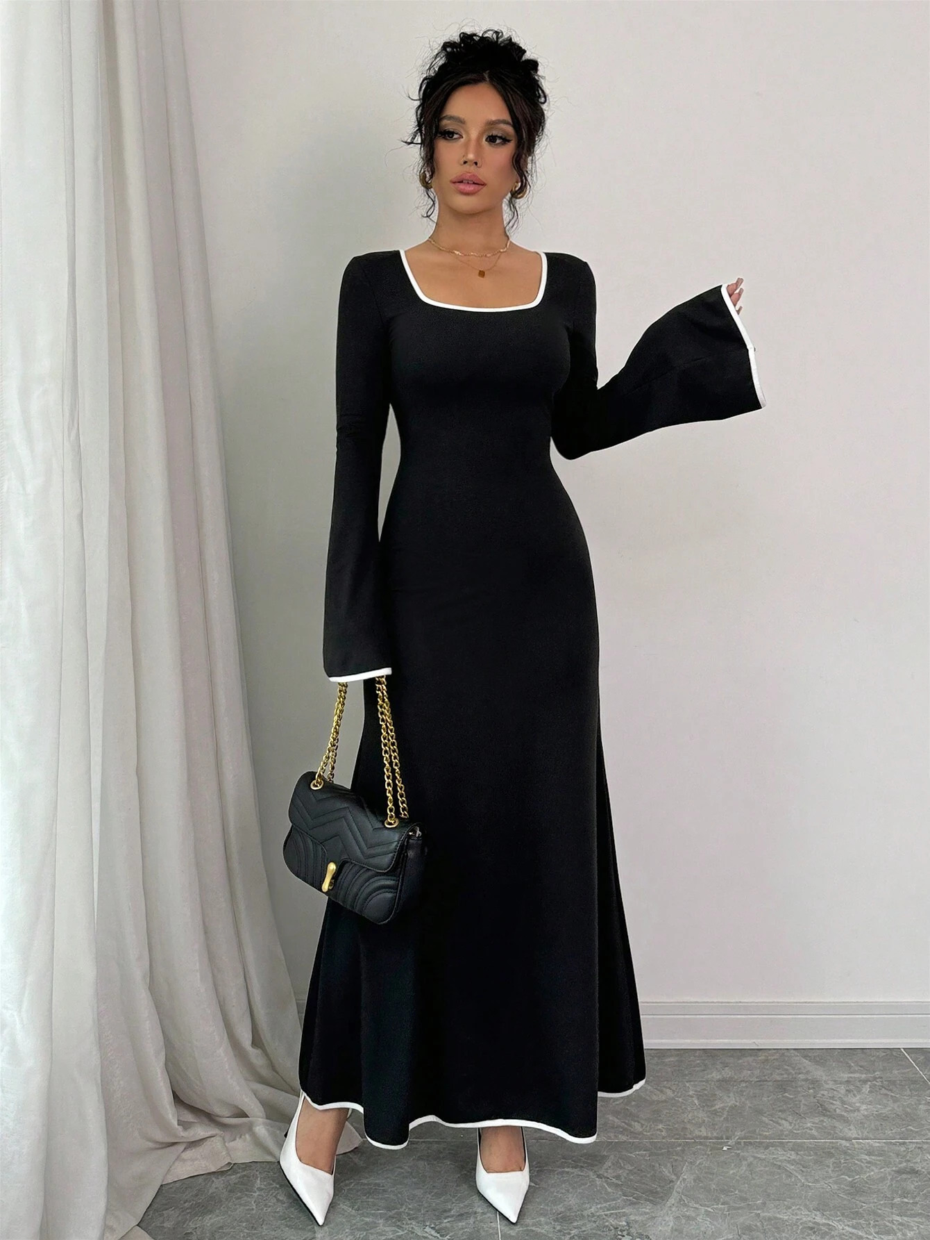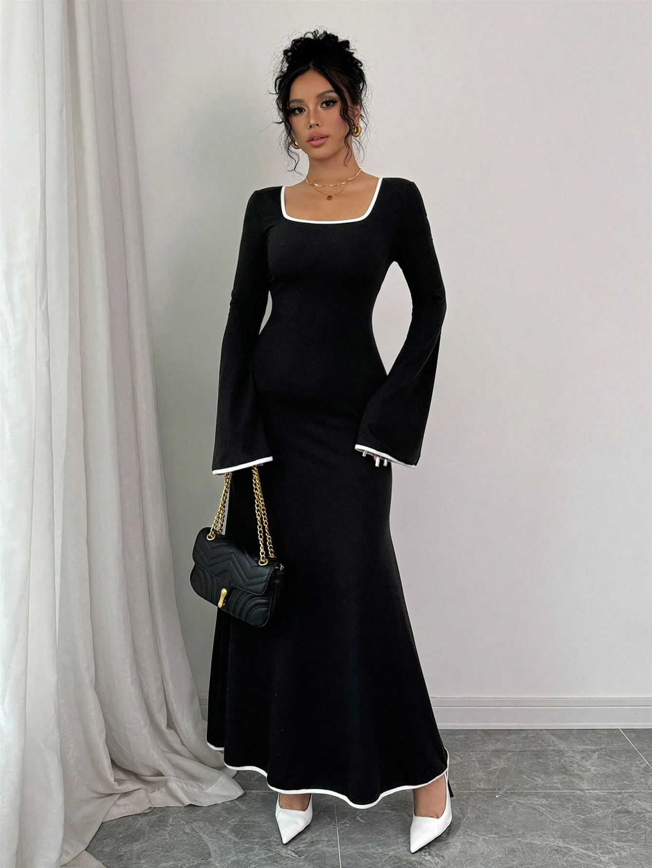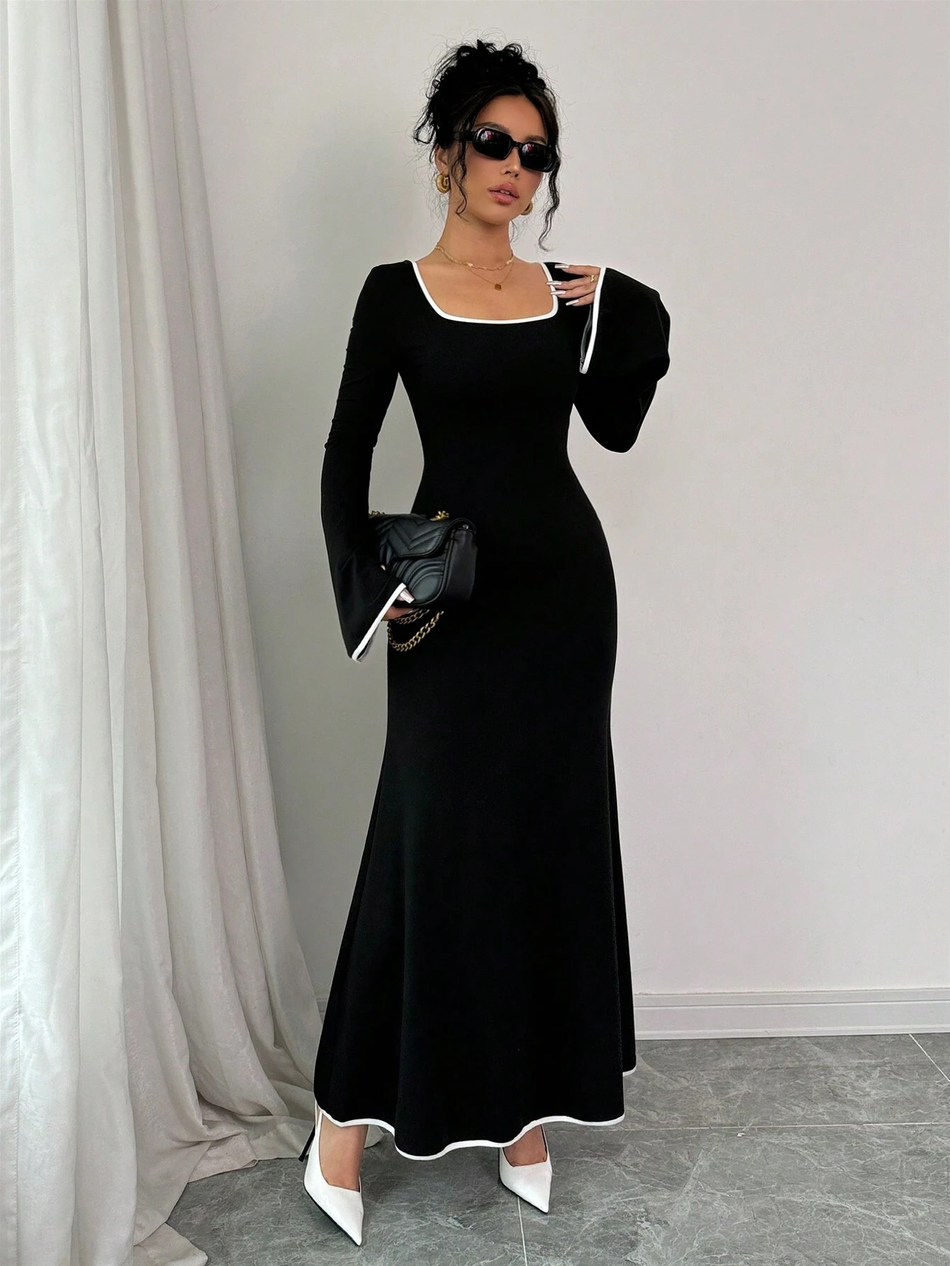 Temperament Square Neckline Famous Style Color Block Slim And Elegant Dress