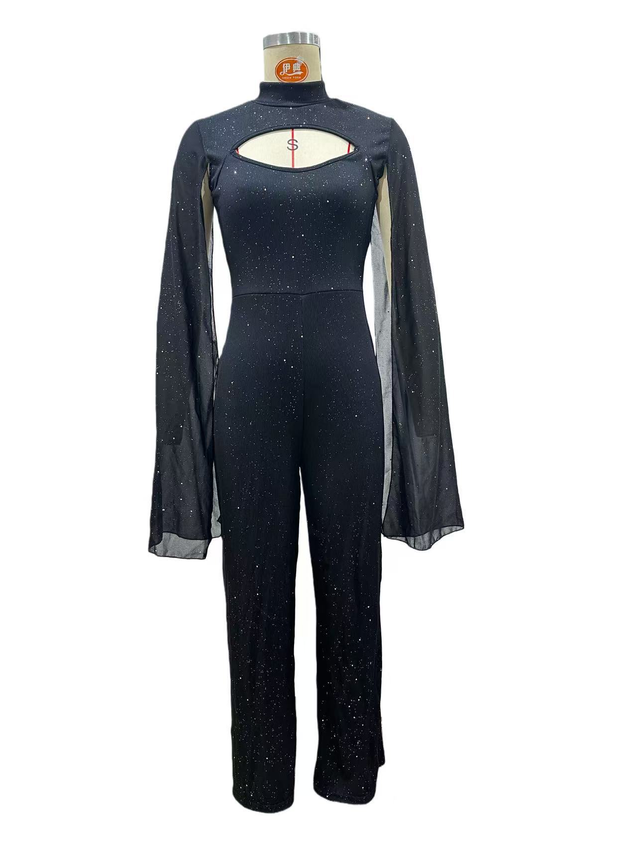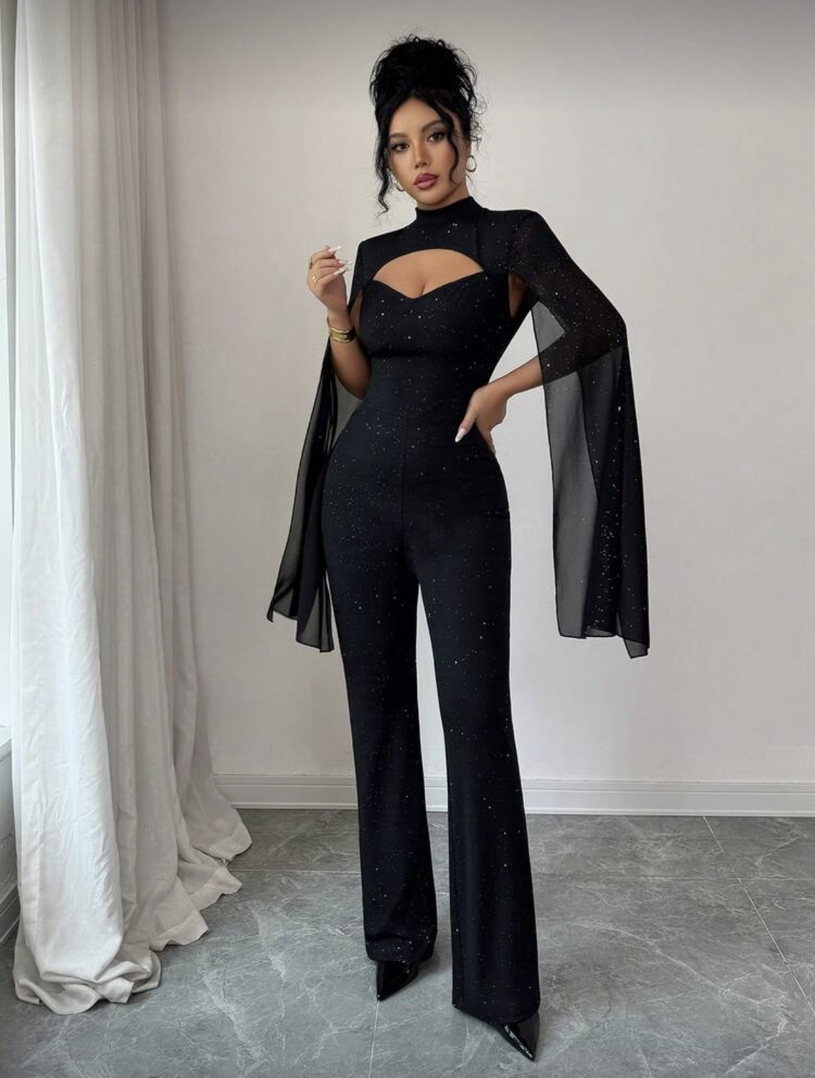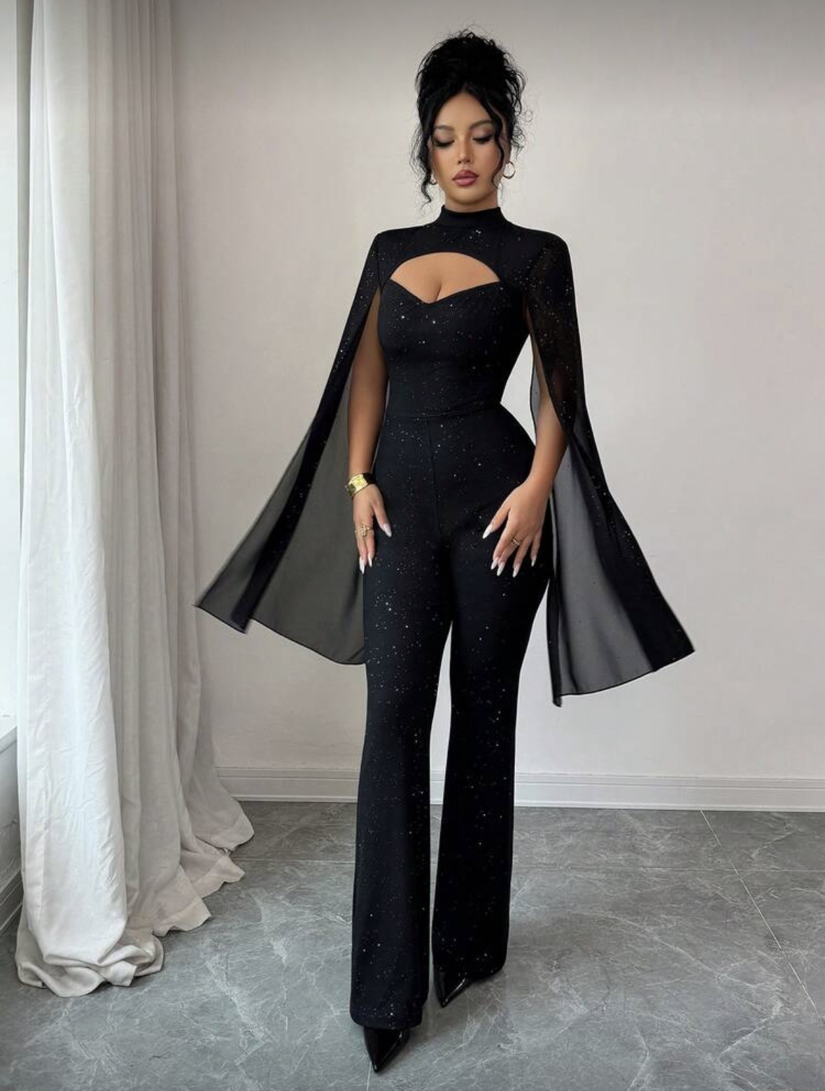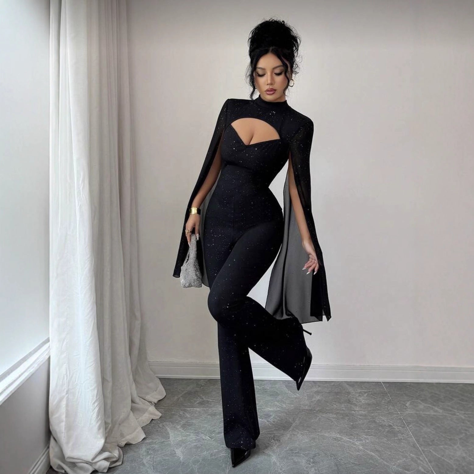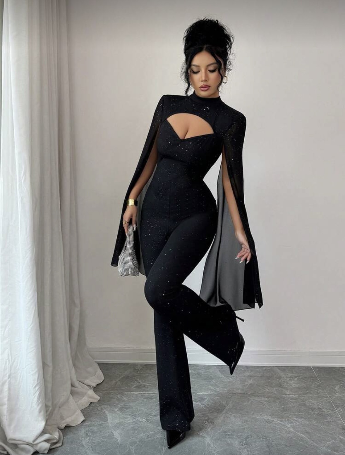 Women's Crew-neck Ribbed Chiffon Cape-style Bodycon Jumpsuit