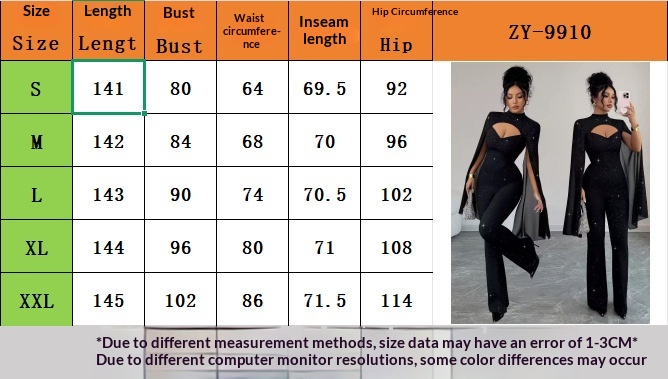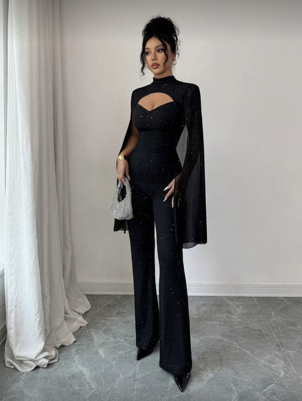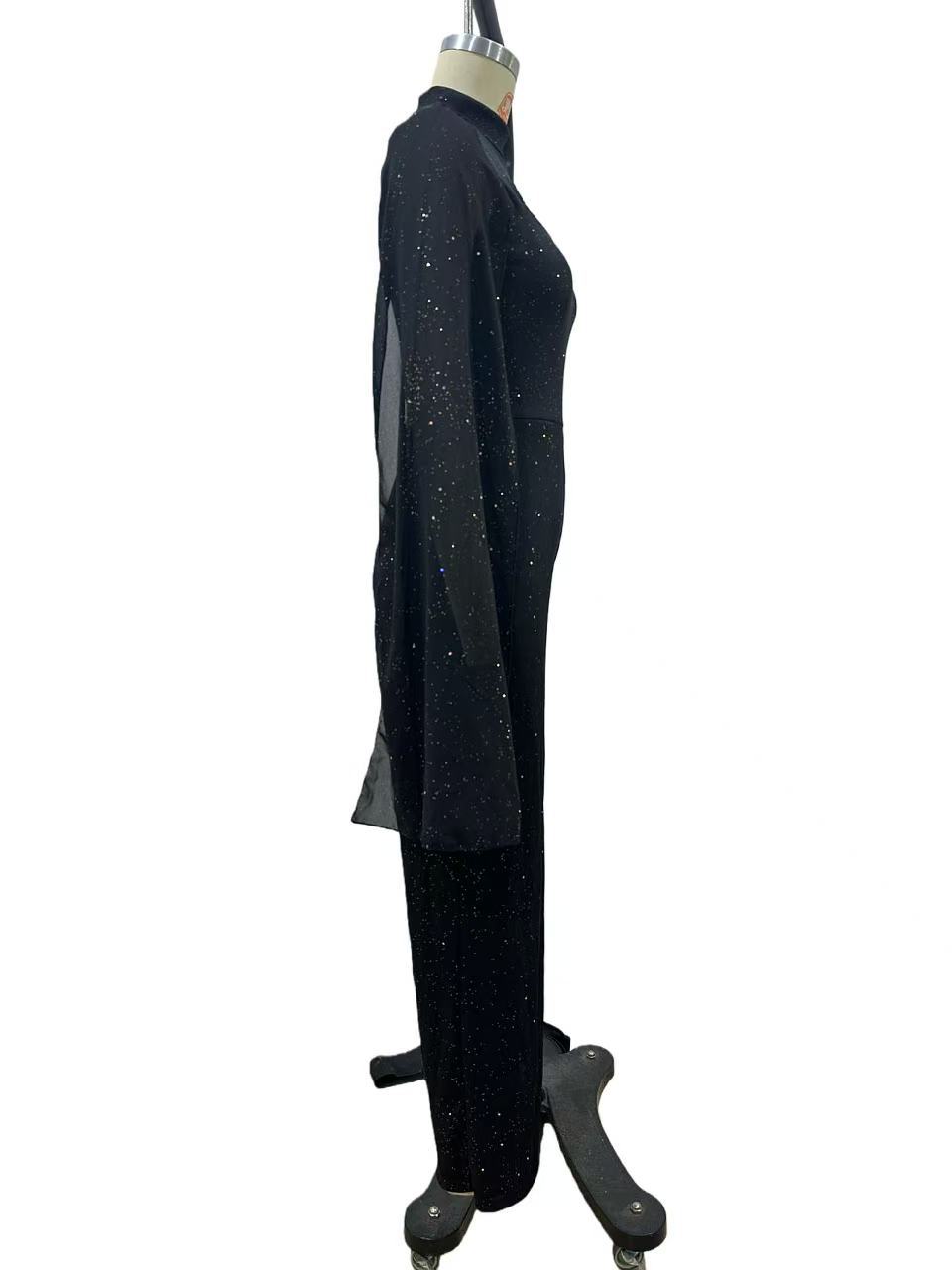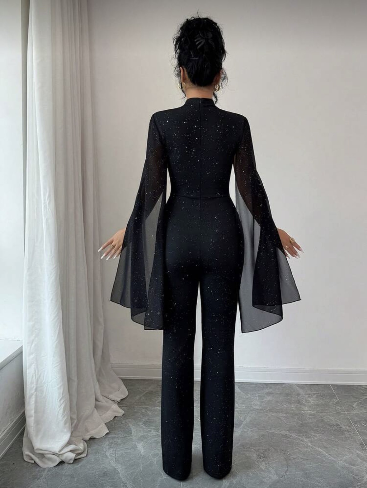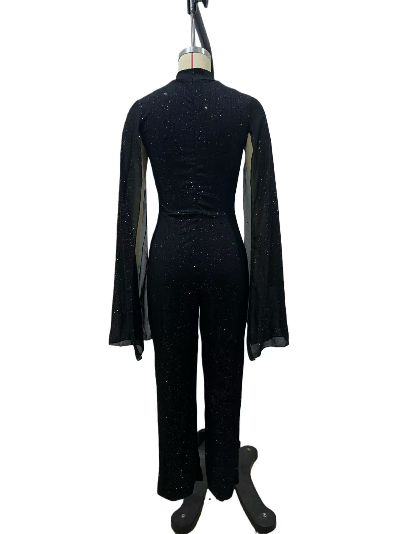 Women's Crew-neck Ribbed Chiffon Cape-style Bodycon Jumpsuit