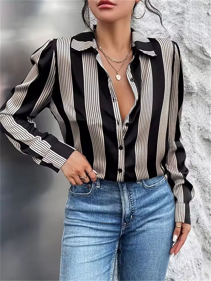 Womens Fashion Striped 3D-Printed Long-Sleeve Shirt