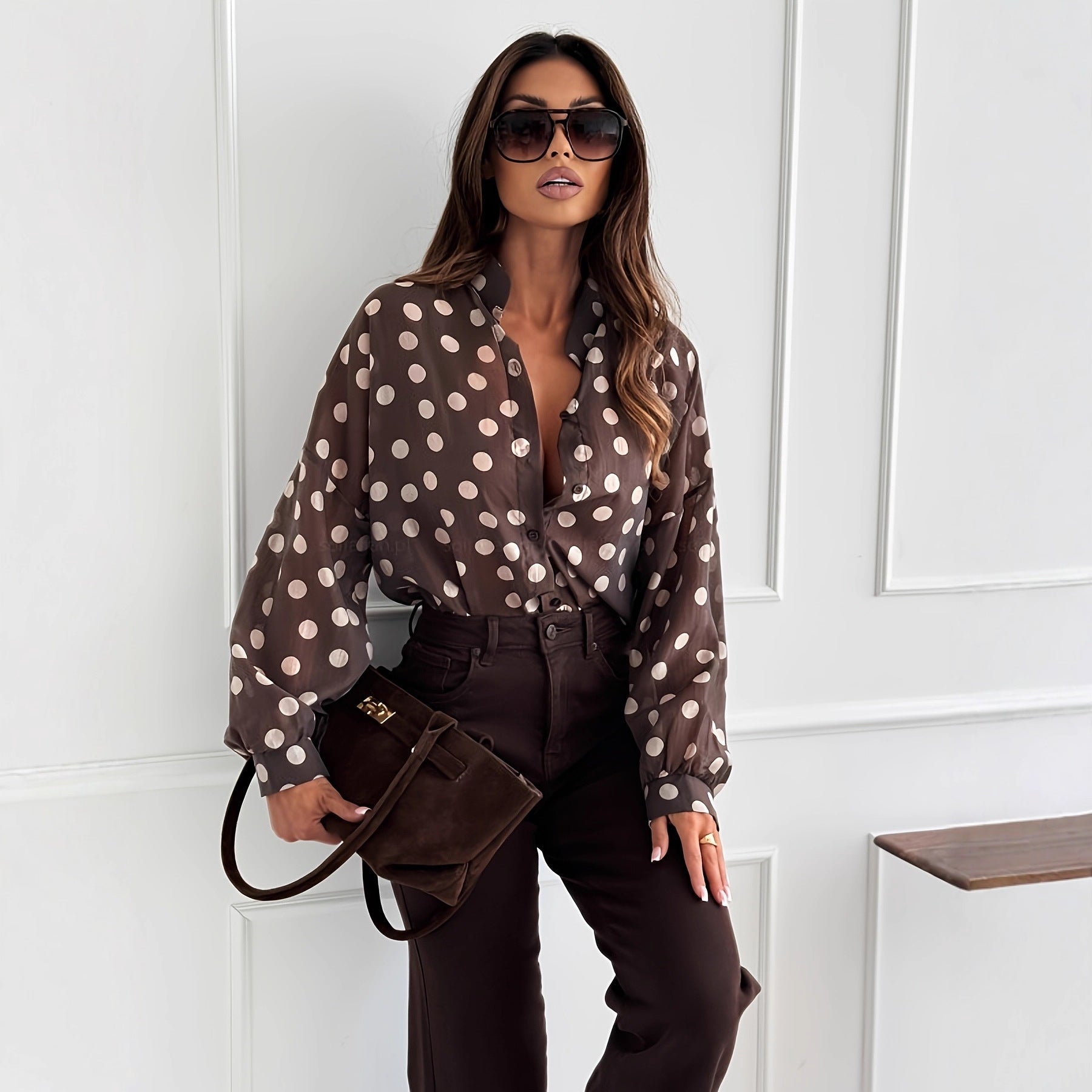 Womens Minimalist Long-Sleeve Polka-Dot Waist-Cinching Office-Ready Shirt