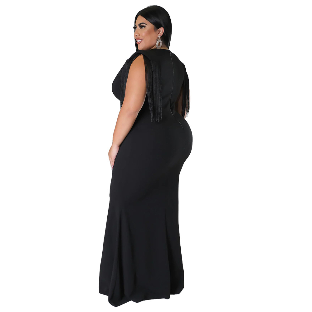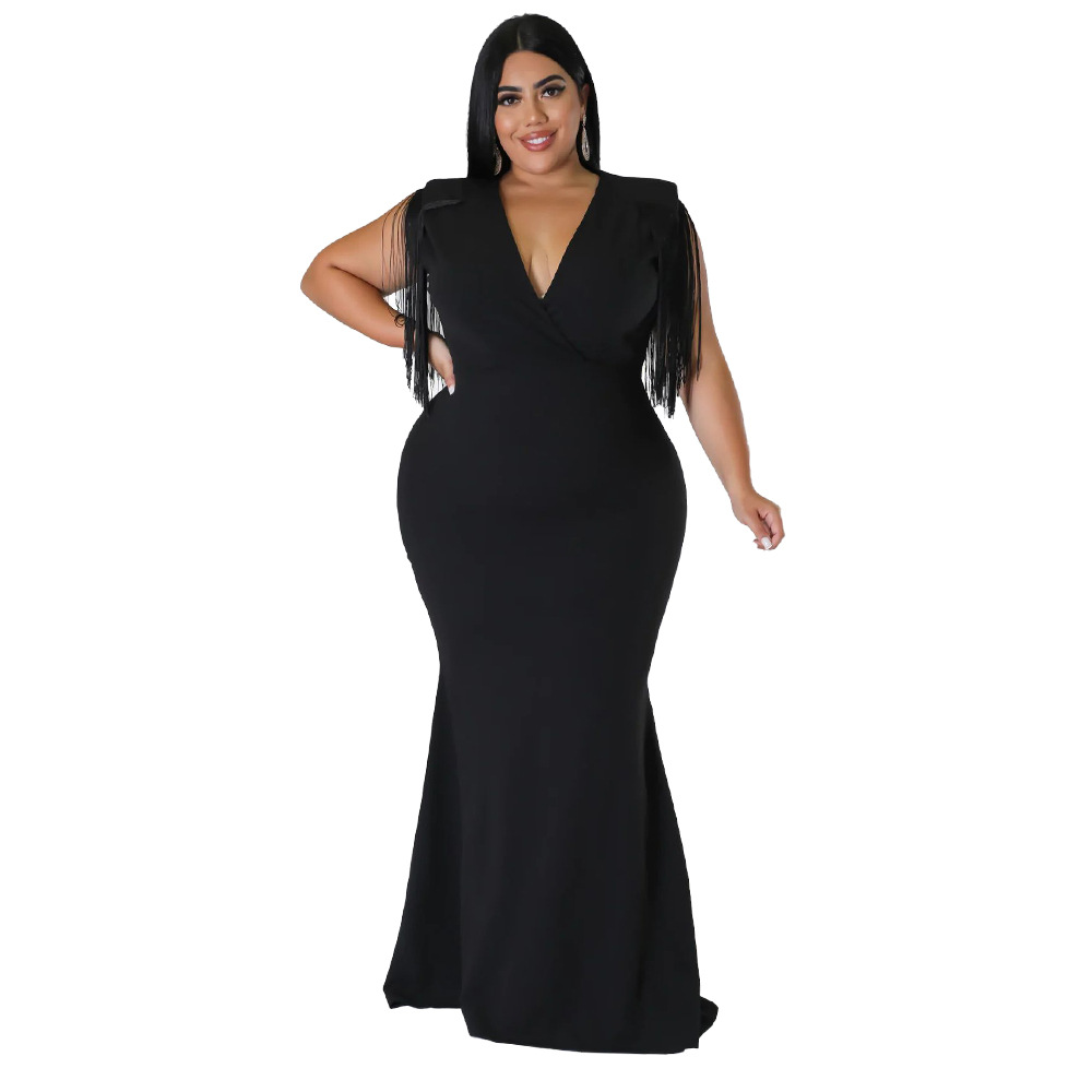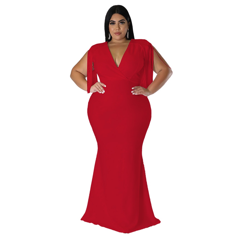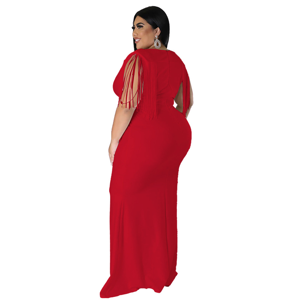 Women's Plus-Size Tassel V-Neck Long-Sleeve Slim-Fit Dress